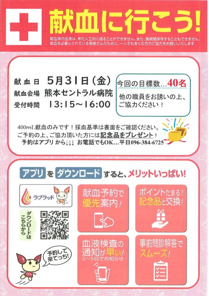 献血に関するお問い合わせはこちらへ 熊本県赤十字血液センター TEL:096-384-6725