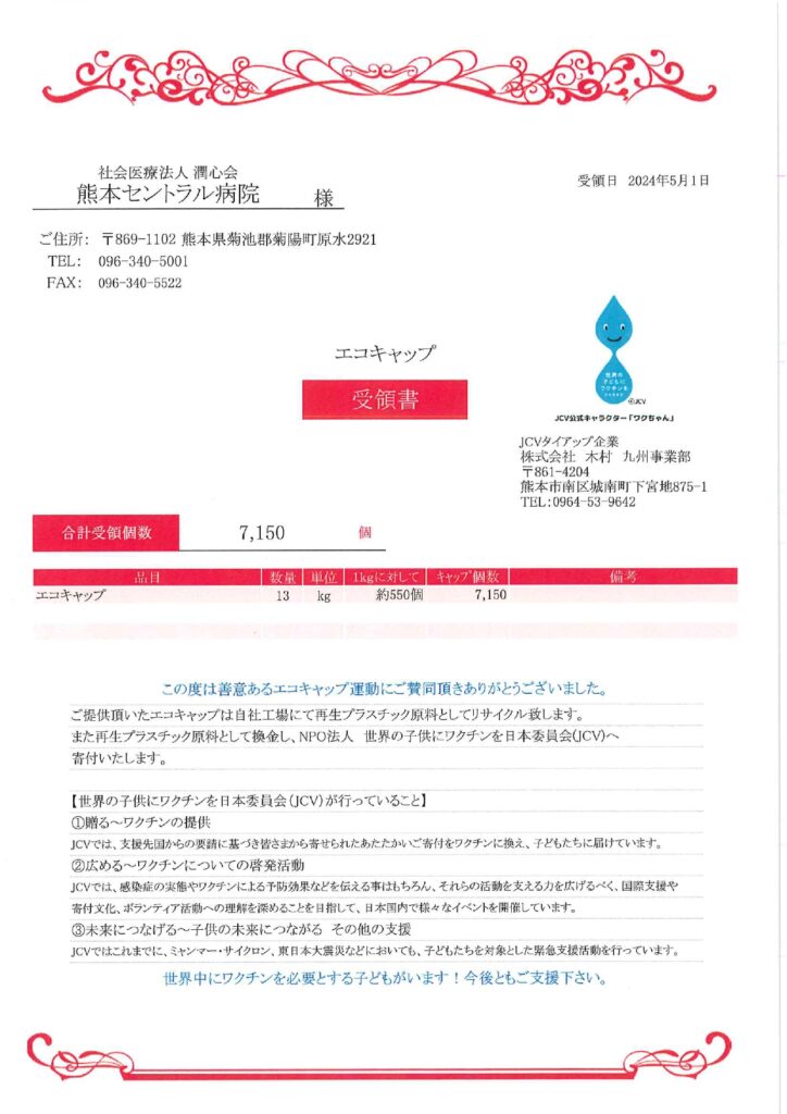 当院ではSDGsの取り組みの一環として、「エコキャップ」の回収をし、リサイクル業者へ持ち込み、「エコキャップ」を寄付するこで世界の子供達へのワクチン支援活動に取り組んでおります。