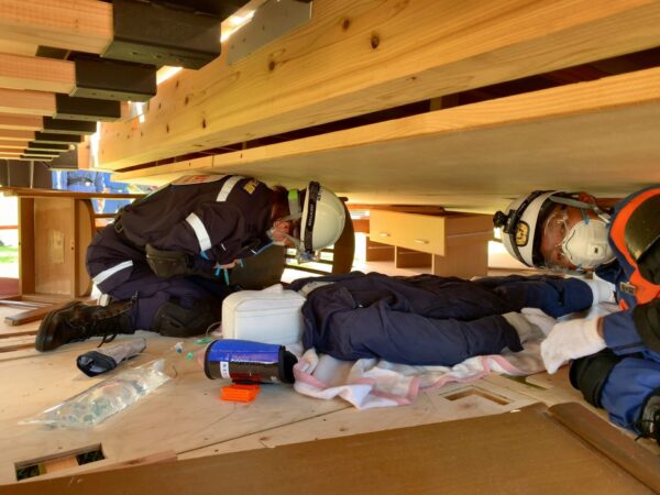 訓練では、倒壊した1階部分に3人が閉じ込められたと想定。消防団員がのこぎりで2階床部分に穴を開け、DMATメンバーが脚を挟まれたダミー人形に点滴や薬剤を投与して、救出する流れを確認しました。