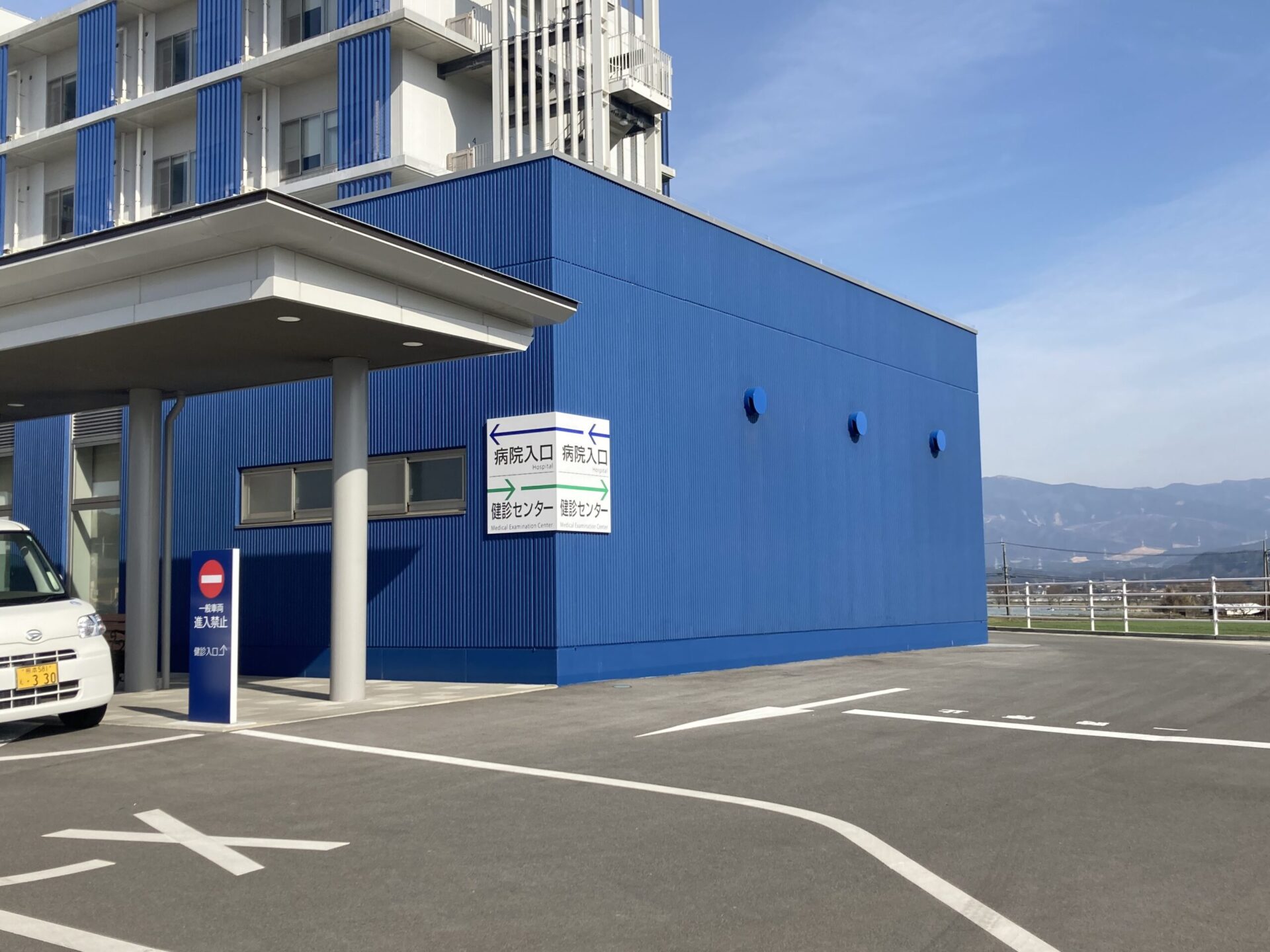熊本セントラル病院のイメージカラーでもある青い建物に真っ白の看板が駐車場からもよく見えます。