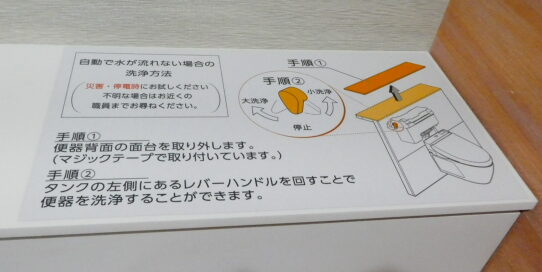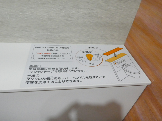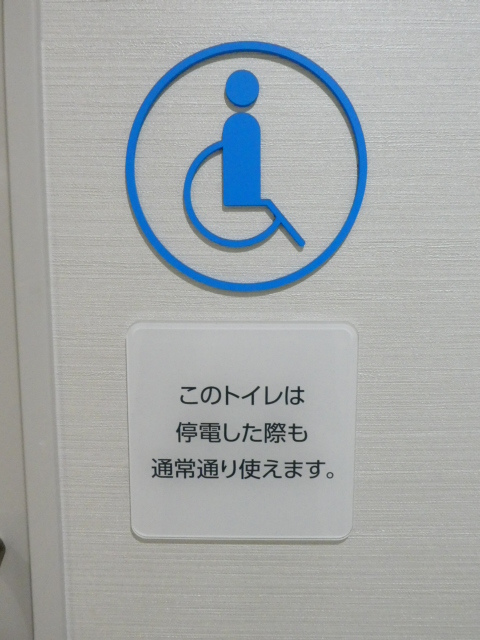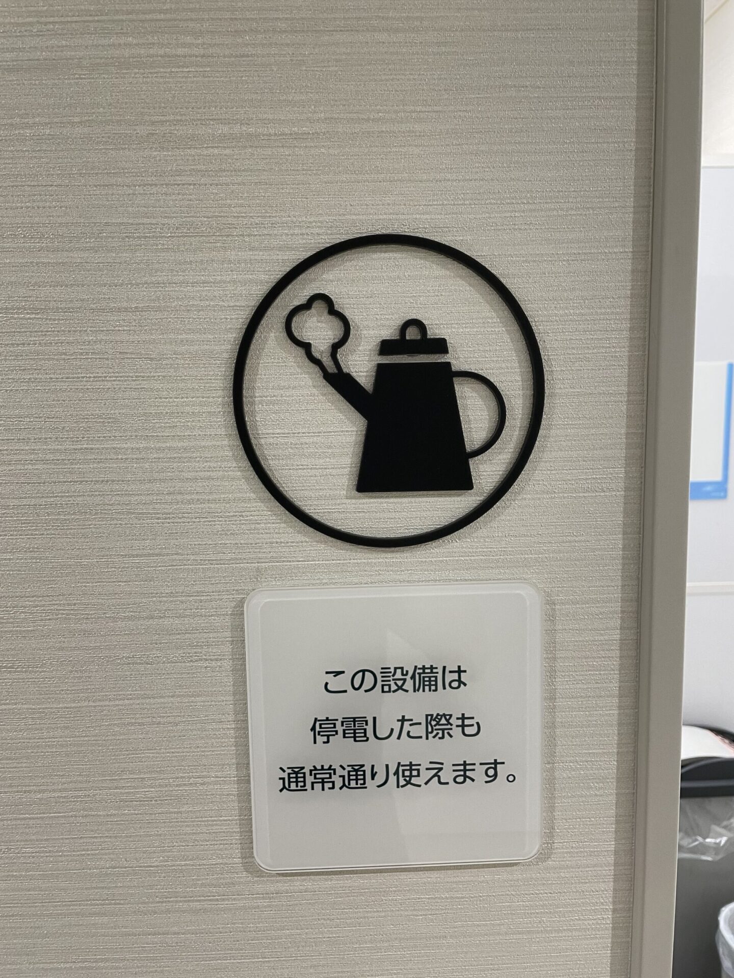 停電時にも通常通り使用可能なのかひと目でわかるように、トイレや空調リモコンなどに、サインを設置しました。