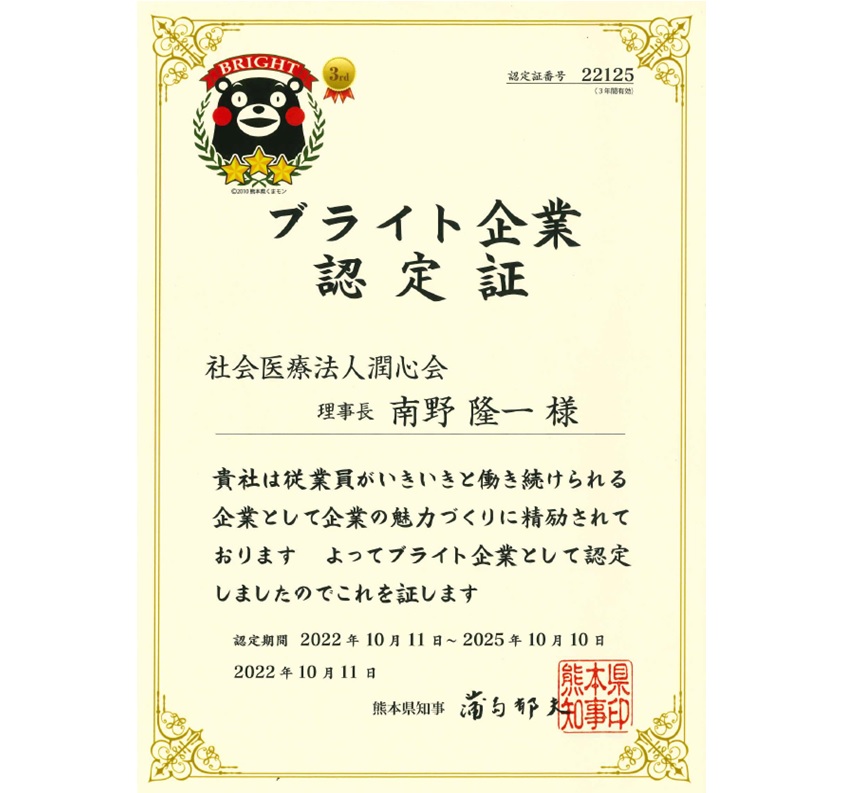 当院は平成28年から熊本県の「ブライト企業」 認定を頂いており、