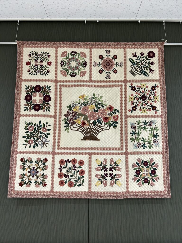 パッチワークキルトをする人は誰でも憧れる、ボルチモア地方の花のキルトです。(吉永)