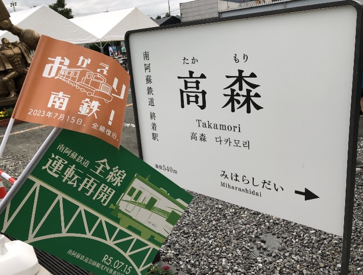 7月15日、南阿蘇鉄道が全線で運転再開されました。沿線では地域住民が歓迎の旗を振りお祝いモード。また、高森駅での記念列車出発式にはくまモンも立ち会い、