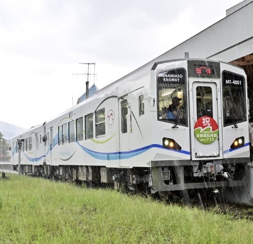 7月15日、南阿蘇鉄道が全線で運転再開されました。沿線では地域住民が歓迎の旗を振りお祝いモード。また、高森駅での記念列車出発式にはくまモンも立ち会い、