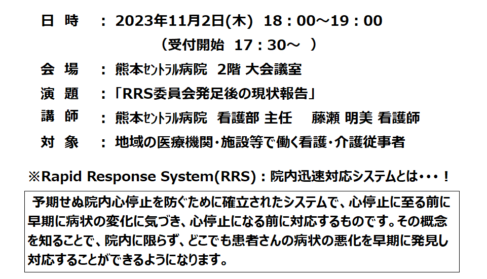 詳細は以下をご確認ください。 → 看護・介護勉強会 ご案内.pdf 参加をご希望される場合は申込書をダウンロード頂き、 必要事項をご記入の上、FAXをお願いいたします。 → 申込書.pdf 申し込み期限 : 10月13日(金) みなさまのご参加をお待ちしております。