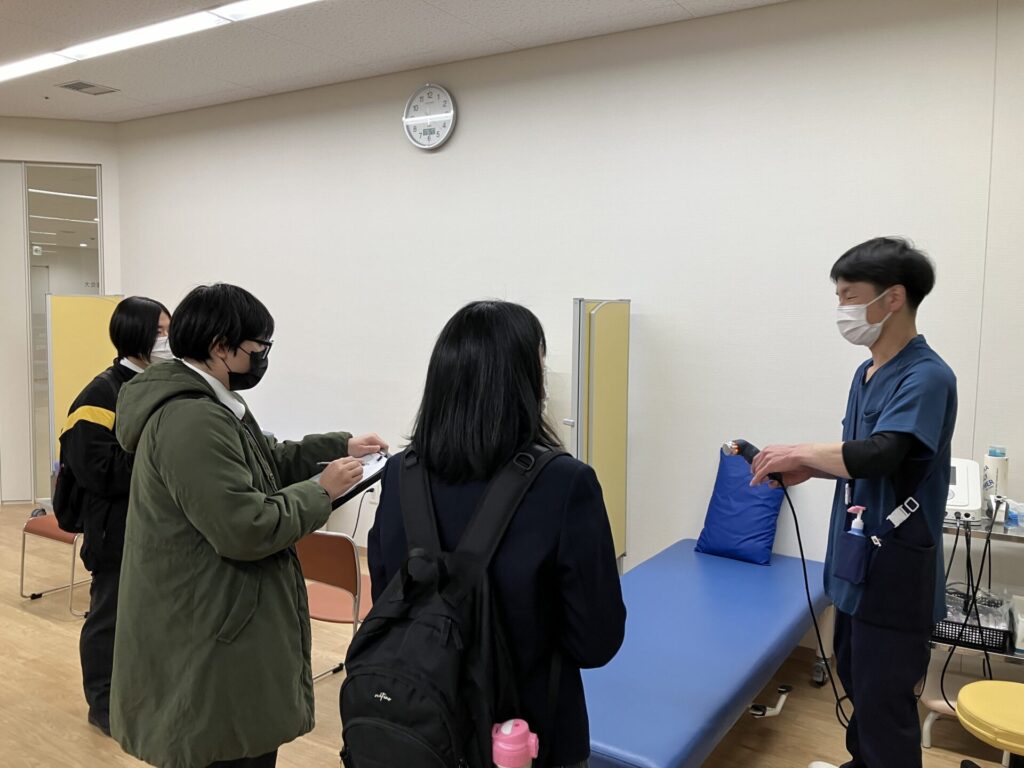 生徒さんの方で事前に準備された質問の対応を行い、その後リハビリ室、手術室、病棟、外来診察室等病院内を見学しました。