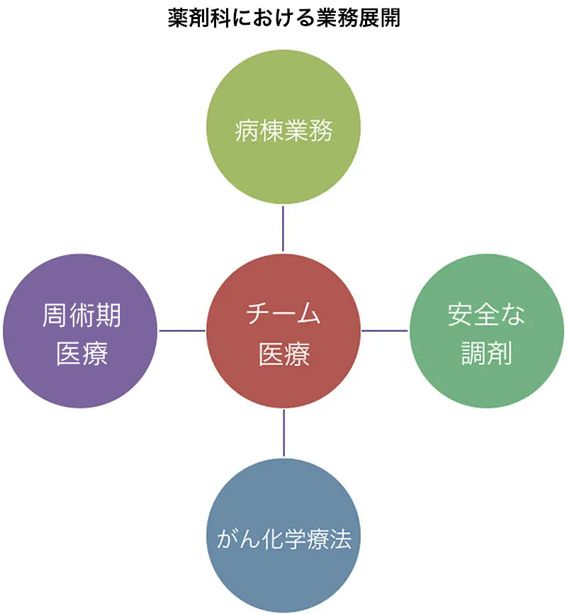 薬剤科の業務は、患者さんが安全で効果的に医療を受けるために、医薬品が適正に使用されるように管理することです。