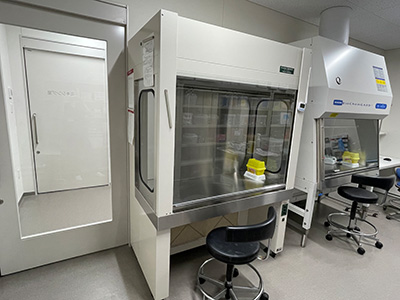 無菌性を要する高カロリー輸液や、調剤時に安全面に配慮が必要な抗悪性腫瘍薬はクリーンベンチや安全キャビネット内で混合調製を行っています。手術室で使用する麻薬の無菌調製また製剤業務にて、患者さんの検査や手術に必要な薬剤で市販されていないものは病院内で調製しています。抗悪性腫瘍薬を調製する際は、閉鎖式薬物移送システム(CSTD)を全ての症例で導入しています。