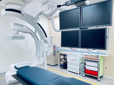 血管造影検査とは細い管(カテーテル)を使って造影剤という薬剤を血管へ流し込み、血管性病変の有無を調べるための検査です。検査は腕、または太ももの付け根よりカテーテルを挿入し、造影剤を流しながらX線撮影を行います。狭くなっている血管や、腫瘍に栄養を送っている血管を見つけ、治療することも可能です。当院では主に狭窄血管に対する血管拡張術や肝細胞がんに対する肝動脈化学塞栓療法(TACE)などの治療を血管外科や消化器科で行っています。また、これらの治療を含めたIVR治療を放射線科も担当致します。